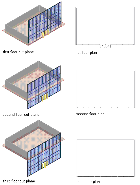 The following images illustrate a curtain wall that spans 3 levels. The images on the left indicate the cut plane for the associated level drawing. The plans to the right show how the curtain wall would be displayed in plan view at each level. Notice the different appearance of the doors and mullions on the various floor plans.