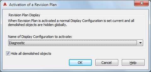 New and existing construction objects display on a revision plan, and all demolition objects are hidden. By switching between renovation plan types, you can work in different “views” of the drawing, avoiding errors by editing multiple drawings. Display settings for the revision plan type are located in the Renovation Options dialog box.
