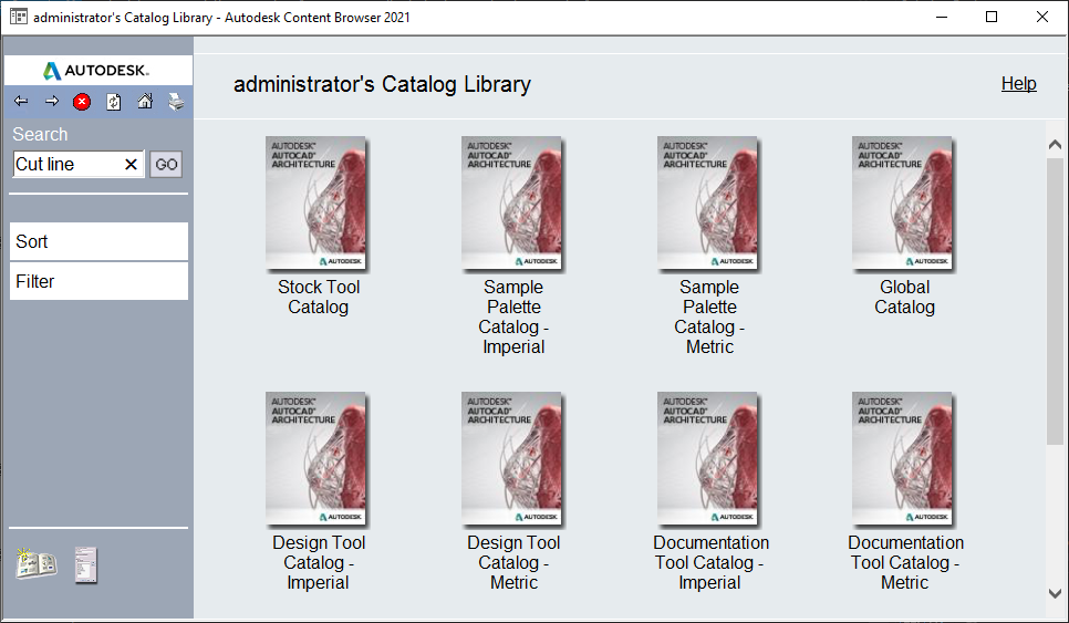 The Content Browser window usually is divided into two panes (web pages displayed in the Content Browser occupy the entire window). Tool catalogs and their contents are displayed in the right pane. When you start the Content Browser, your personal catalog library, named <user_name>’s Catalog Library, displays in the right pane. The left pane is used for navigation, searching for tools, sorting catalogs, and filtering catalog display. The buttons at the top of the left pane work much like the equivalent controls in a web browser.