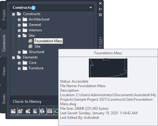 In the Project Navigator, you can display thumbnail previews of project drawings. The preview can be a graphic or a detail, or a combination of both. Displaying thumbnails can be helpful when you are navigating large projects with many drawings.
