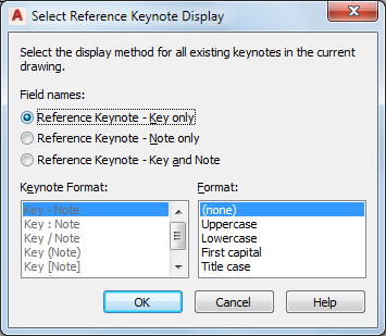 2. In the Select Reference Keynote Display or Select Sheet Keynote Display dialog box, select an option for Field names. If you select the Key and Note option, you can also select an option for Keynote Formats. You can change the Format setting regardless of the Field name selection.