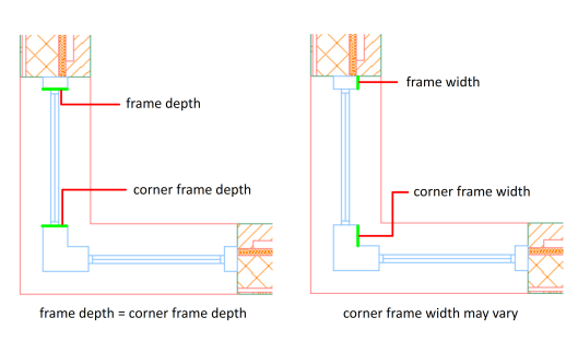 In a corner window, frame depth and corner frame depth are equal. Frame width and corner frame width may vary. The shorter side of the corner frame is used to determine the corner frame width.
