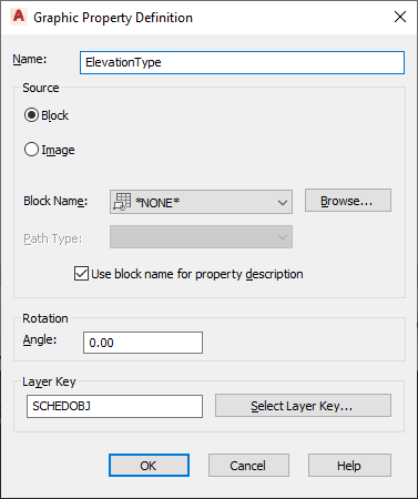 Use this procedure to add a graphic property definition to a property set definition. Graphic property values can be blocks in the current drawing or image files, such as BMP, GIF, JPG, PNG, or TIF. The image displayed cannot be edited directly.