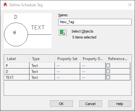 You can create the schedule tag by drawing a symbol and adding text as a placeholder for attributes or by exploding and customizing an existing schedule tag. When you create a schedule tag, each attribute is assigned a unique name (called an attribute tag), which is formed by combining the names of the associated property set definition and property definition. When the schedule tag is anchored to objects to which the property set definition applies, the tag displays the value of the property identified by the attribute tag.