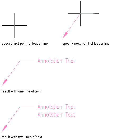 Use this procedure to add a multiline text object with a single leader that points to any point you specify in the drawing area. Leaders are drawn in the same manner as polylines: you specify two points to insert a straight line segment. Or, depending on the setting for the Limit points property, you can specify additional points to insert an angled leader consisting of two or more segments.