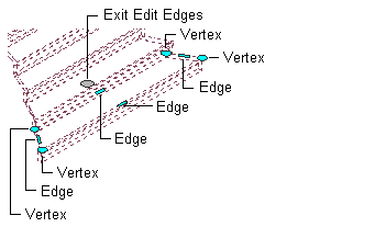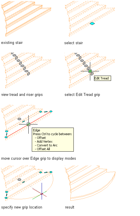 You can select either edge or vertex grips to modify the face of the tread. The following grips are displayed for editing the face of a custom stair tread:
