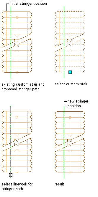 Use this procedure to replace an existing custom stair stringer path with a new stringer path by selecting linework. The linework must occur within the stair to be valid for selection as a replacement stringer path, and must follow the entire length of the stair.