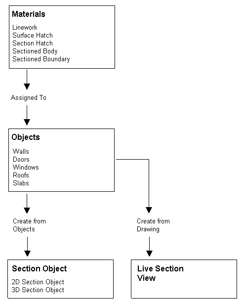 When you create a 2D or 3D section object from building objects, the material assignments of the source objects are applied to the section. You do not assign a material directly to a 2D/3D section. The section takes its material assignments from the objects that are sectioned. For example if you create a section through a wall with a window, the section hatch you have defined in the glass, wood, and brick materials of the wall and the window are displayed in the section.