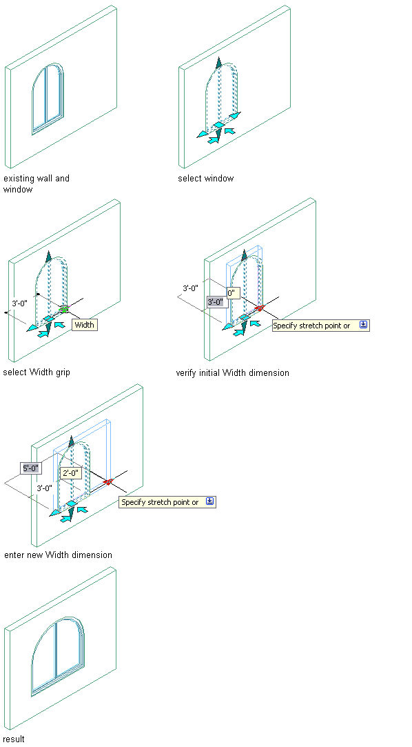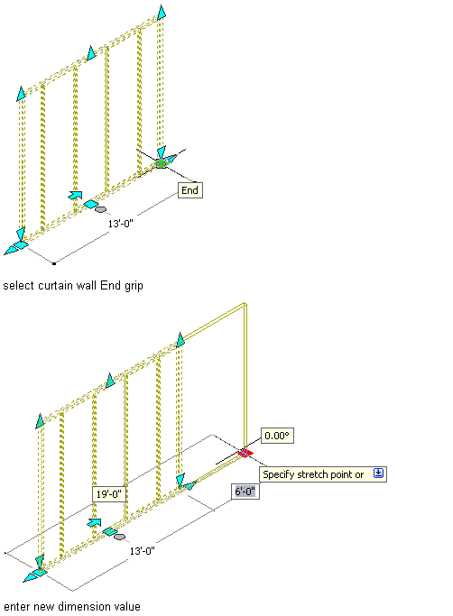 - When a dimension edit box is displayed, pressing Enter sets the value of the property that you are editing and ends the grip operation. Pressing Tab sets the value, changes the focused dimension, and continues the same grip-editing operation.