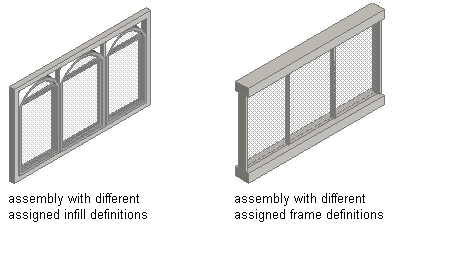 You can create new element definitions and assign those definitions within the door and window assembly. For example, you can create multiple infill definitions and then assign different infills to specific cells in the grid. Likewise, you can create multiple frame definitions and then assign a different definition to each frame edge (top, bottom, left, right). This is also true for mullion definitions.