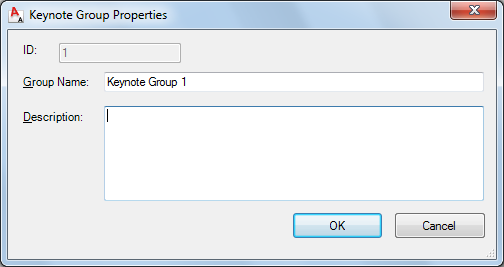 The Keynote Group Properties dialog box is displayed with the read-only ID field showing the database identifier for the group you are editing.