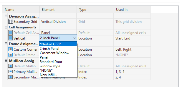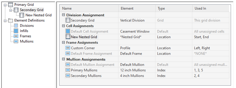 Use this procedure to create a nested grid in a curtain wall unit. A nested grid is a grid within a grid. Each nested grid has its own division, cell assignments, frame, and mullions. By default, the frame is turned off for nested grids.