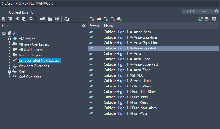 When you click the link, the Layer Properties Manager opens, and the Unreconciled New Layers filter is automatically selected. All new layers that have been added to the drawing or attached xrefs are displayed in the list view.