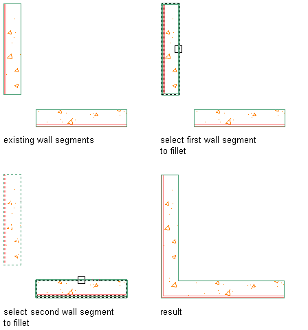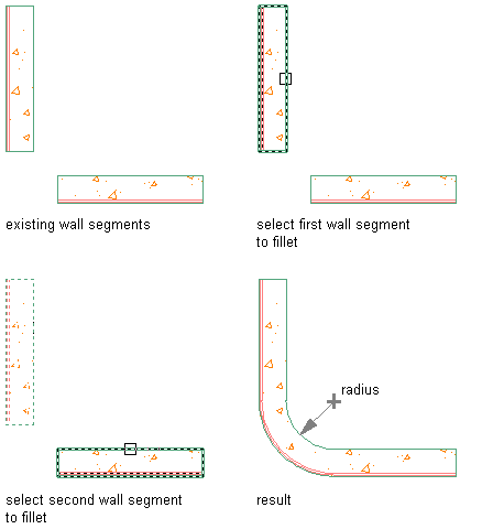 The following illustration shows how to fillet two wall segments with a specified radius.
