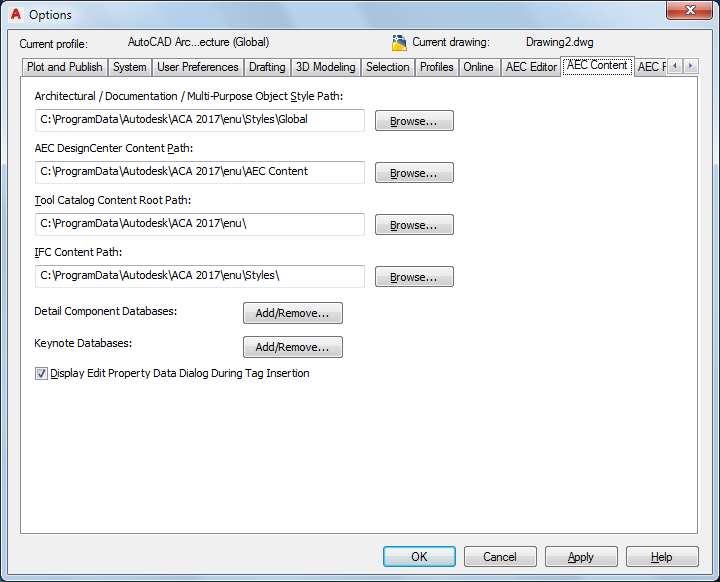 The variable, %AECCONTENT_DIR%, used for tool-dependent file references, is updated to use the path you specify. For example, <Style href=“%AECCONTENT_DIR%Door StylesDoorStyles.dwg”/>.