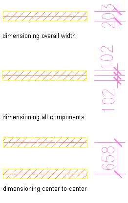 Length of Wall: Outer Boundaries Dimensions the outer boundaries of every selected wall. When wall boundaries overlap, only those facing the dimension direction are dimensioned.