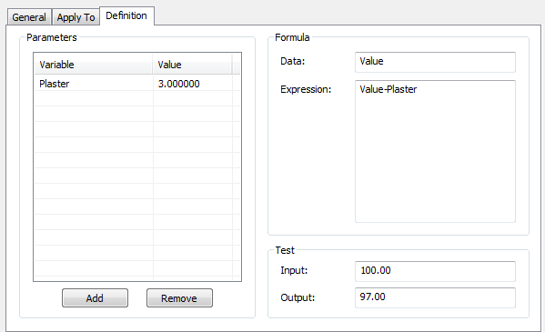 For example, if you want to set up a plaster deduction of 3 percent, and you have defined a variable called Plaster_Deduction with a value of 0.97, enter AreaValue * Plaster_Deduction.