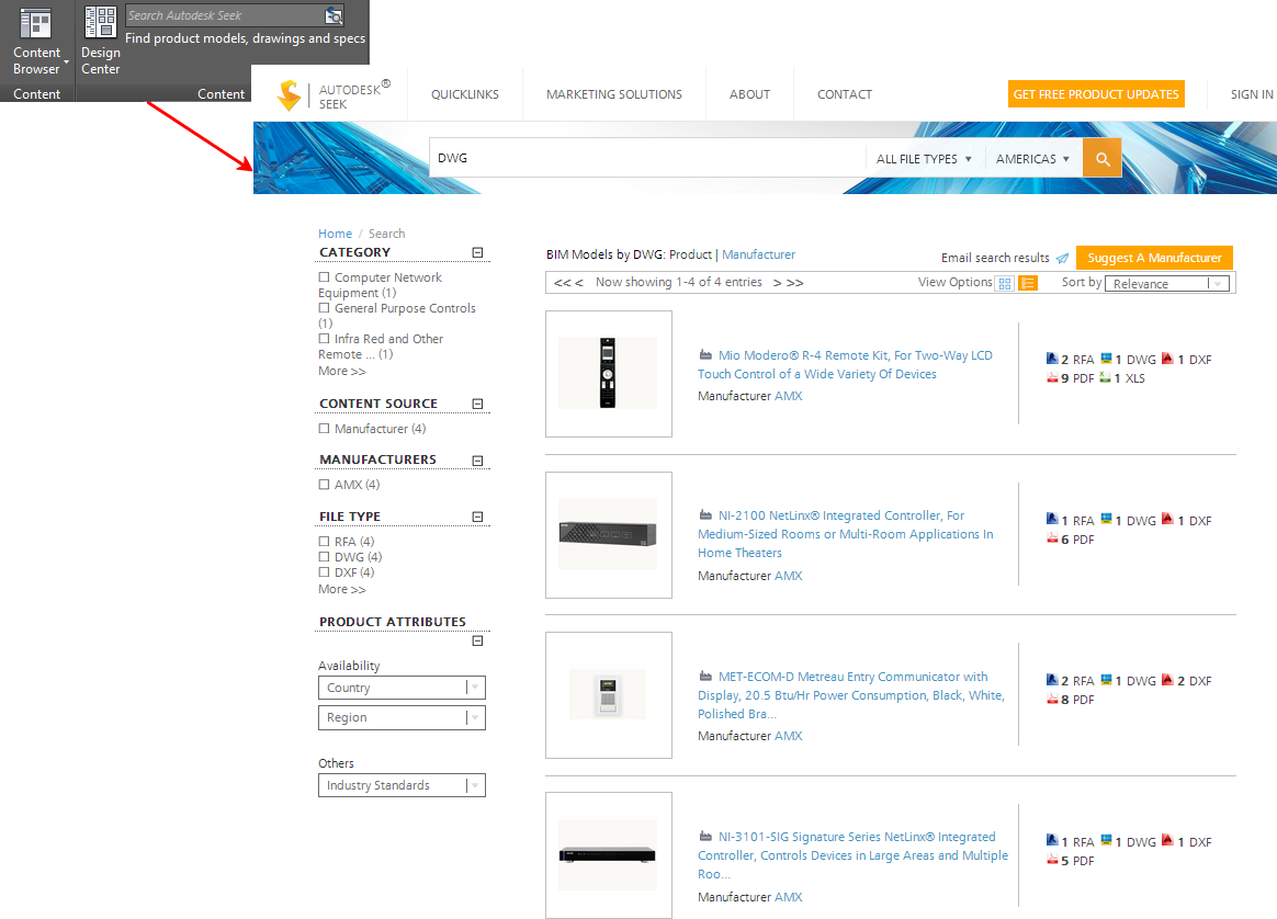 You can use Autodesk Seek to find product design information. Many content providers, both corporate partners and individual contributors, publish to Autodesk Seek. Content includes 3D models, 2D drawings, specifications, brochures, and other descriptions of products or components.