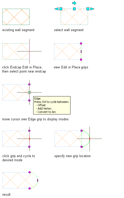 In the following example, a wall endcap edge is converted to an arc with an Edge grip.