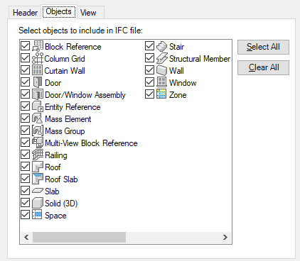 - Click the Objects tab and select the objects to be included in the IFC file.