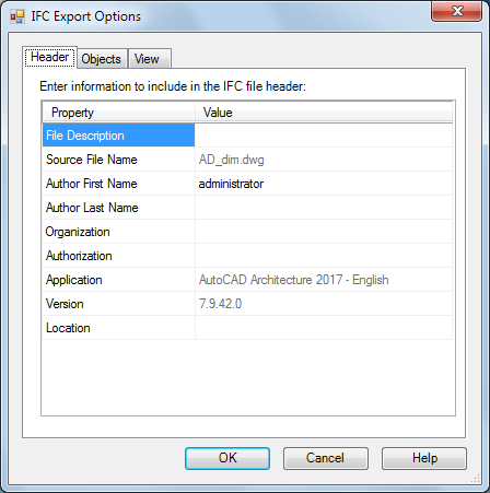 The name of the drawing active on your screen displays on the Header tab of the IFC Export Options dialog box. You can add information about the drawing file to be exported, such as a description of the drawing, the author and company name, authorization data, and the geographic location of the building. For example, you could enter the description of a structural drawing as Structure for Commercial Building 152 on the Header tab. This information displays in the header of the IFC file when the file is viewed.