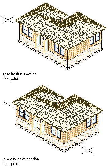 Use this procedure to draw a section line with a section mark at each end. You draw a section line by specifying a start point, an endpoint, a length, and a height for the section. You can specify additional points between the start point and the endpoint to create jogs in the section. The section line acts as a cutting plane, slicing a section from the building model.