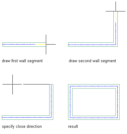 This option closes the wall by creating a wall segment from the last point specified for the walls to the first point specified in this group of walls. You enter c (Close) at the command line to use this option when placing walls.