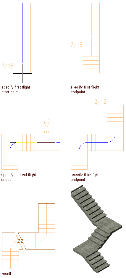 If you are drawing the risers or flights of a stair, lines for each tread are shown. If you are drawing a flat landing, no tread lines are shown. If you are drawing a turn-type landing, angled tread lines are shown through the turn. These temporary lines do not necessarily represent the actual locations of tread lines in the final stair. In addition, the number of risers currently added to the stair is displayed (to the left of the stair), as a fraction of the total number of risers required for the stair; for example, “10/18.”