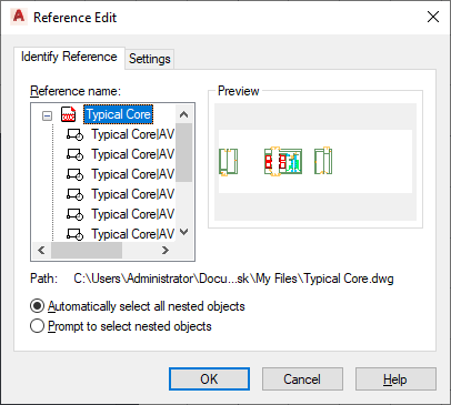 - In the Reference Edit dialog box, on the Identify Reference tab, select Prompt to select nested objects, and click OK.