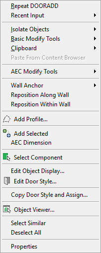 When you right-click in the drawing area, the content of the context menu depends on the currently selected object(s). For example, if one or more door objects are selected, a door-specific context menu is displayed as shown.