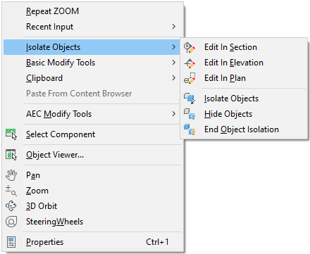 If more than one type of object is selected, the context menu includes only those commands that can be applied to all the selected objects. Likewise, the ribbon displays a Multiple Objects contextual tab that contains only the applicable commands. If no objects are selected, the general context menu is displayed as shown below. This menu contains non-object-specific commands.