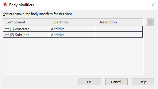 Use this procedure to edit or remove three-dimensional (3D) body modifiers from a slab or a roof slab. You can change the component to which the body modifier is applied or the way it is applied (whether it adds to, subtracts from, or replaces the selected component). You can also enter or edit the descriptions of body modifiers.