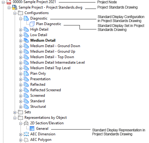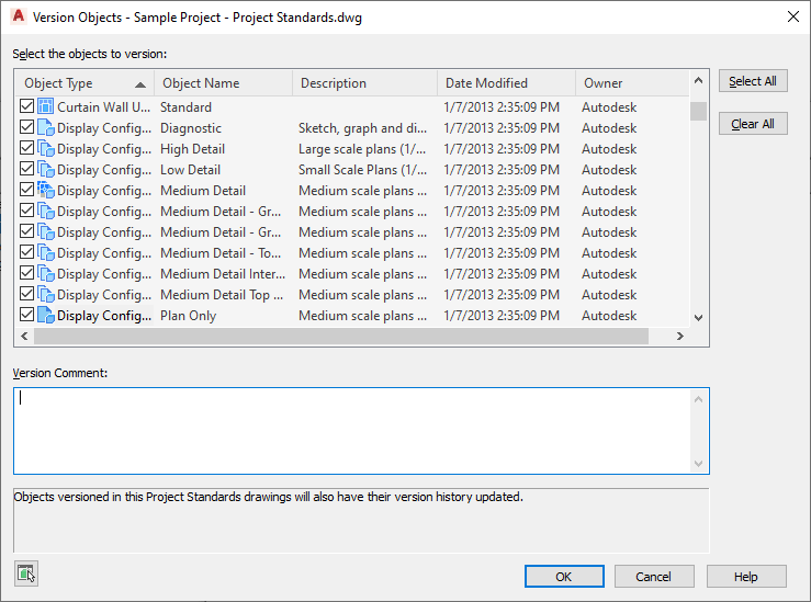 Display settings in the project standards display drawing and in the project drawings are versioned. The version is used to determine whether a display setting needs to be updated during synchronization. The version information includes the GUID (Global Unique Identifier), the date and time of the last modification, the windows login name of who last modified the item, and an optional comment.