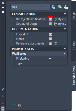 - In the Properties palette, on the Extended Data tab, under Classification panel, click IfcObjectClassification and select the classification.
