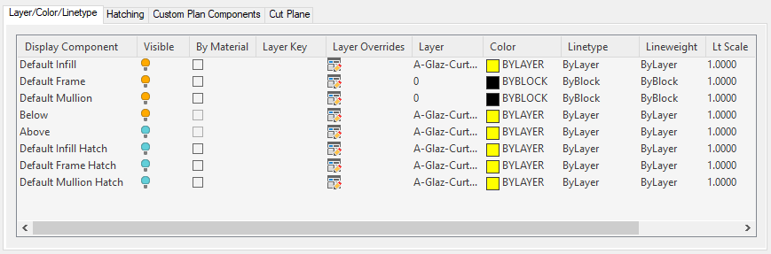 Use this procedure to specify the properties of one or more cut planes for a curtain wall unit style. Cut plane display properties apply only to display representations, such as Plan, that are used in Top view (Plan view) of a drawing.