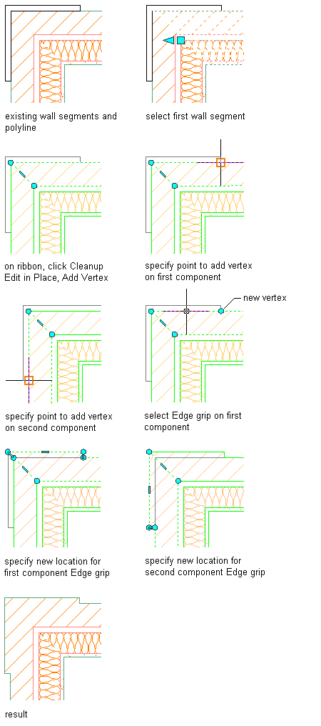 In the following example, new vertices are added to components, then Edge grips are used to modify a brick veneer corner condition.