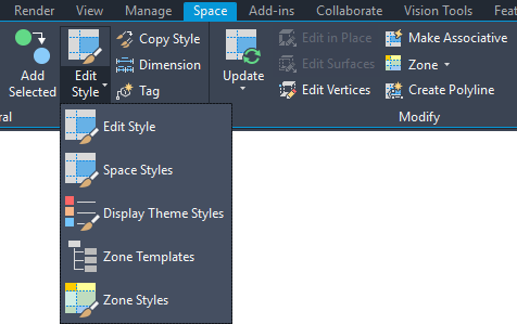Depending on the object you have selected, you may be able to access not only styles for that object, but also styles of objects that act as supporting objects. For example, when you have selected a space, you can access space styles, zone styles, zone templates, and display theme styles.