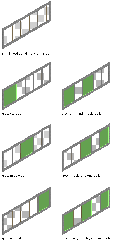 You can auto-adjust the grid divisions by specifying the start, middle, or end cell, or any combination of those cells, to receive the cell growth. The size of each cell depends on which combination of cells you specify. In the following illustration, all of the possible cell growth combinations for an example door/window assembly are shown, with highlighted cells in green.