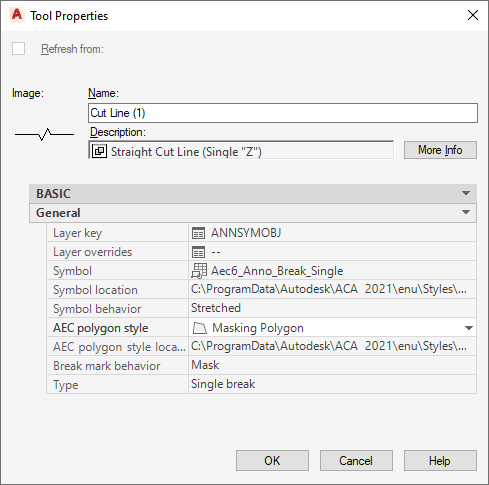 - Break line tools should have supporting elements stored in the same drawing as the break line symbol. As with other multi-component tools, such as schedule tags, it makes them easier to modify in the future. All of the properties for break marks are set in the tool properties, including whether or not the break mark masks or trims objects.