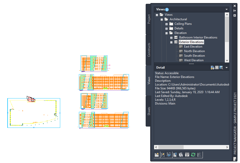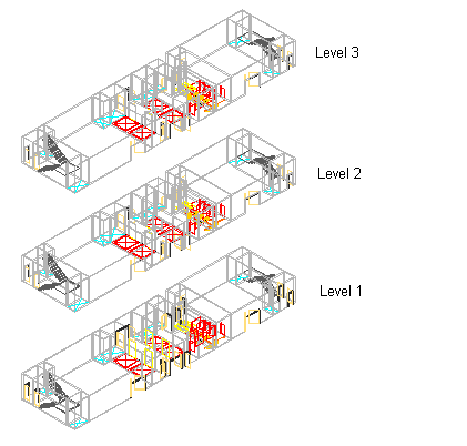 You create a view drawing by selecting constructs from the Project Navigator palette and referencing them into the view drawing. When you are creating multi-level views, each construct is referenced at its relative level height, with the lowest level inserted at Z = 0.