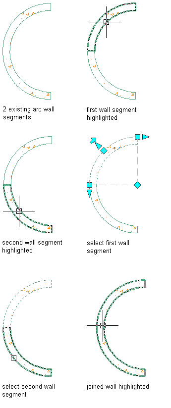 The following illustration shows joining 2 curved wall segments after first highlighting each separate segment.