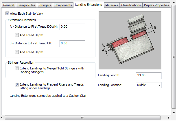 specify stringer resolution and extension dimensions, such as distance to first tread up and distance to first tread down, when you add or modify stairs select Allow Each Stair to Vary.