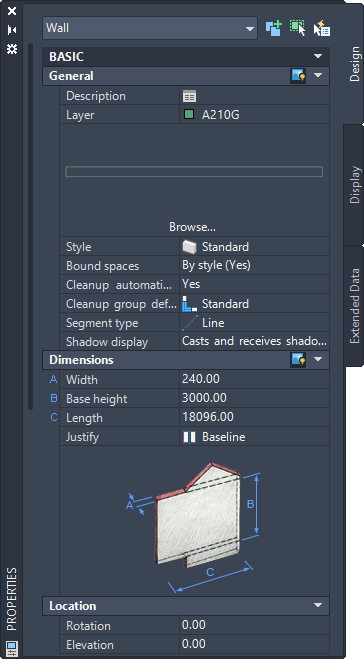 Properties Palette for a standard wall object