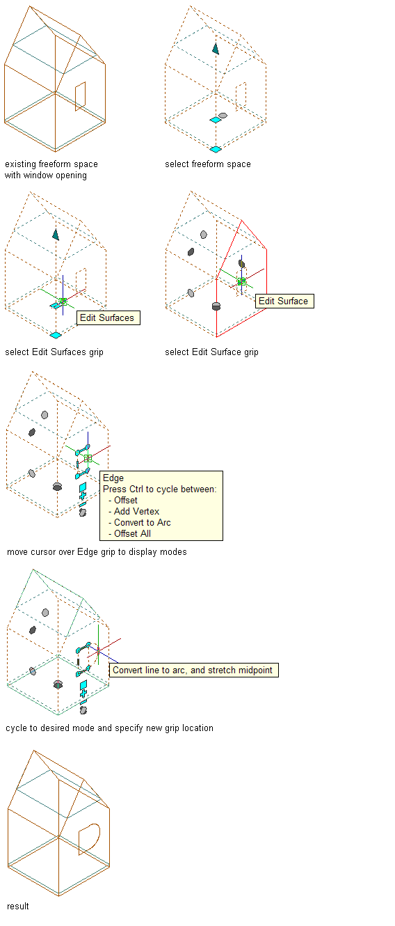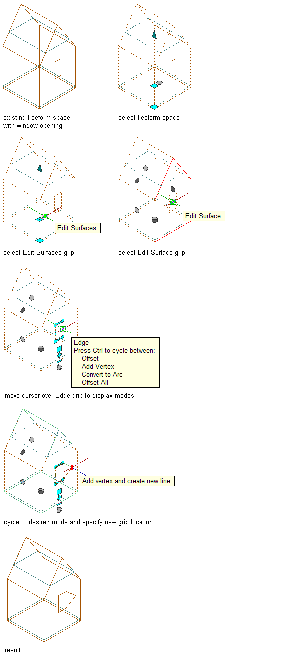 3D freeform space surface openings can be edited like any profile-based boundary in AutoCAD Architecture 2027 toolset. The opening boundary has vertex and edge grips to generate the desired shape.