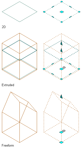 You can change an extruded 3D space to a 2D space, or to a 3D freeform space, and vice versa. You can also make a non-associative space associative to boundary objects or disconnect an associative space from its boundary objects. Each of these operations will change editable properties of the space and the user interaction. The following table shows the results of changing a space from one geometry type to another.