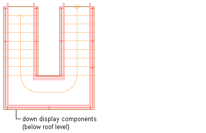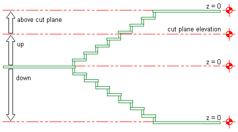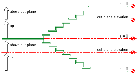 When the Override Display Configuration Cut Plane option is selected, the cut height elevation is measured from the bottom of each stair run. The up display components and the above cut plane display components above the current level are displayed, and the down display components are not.