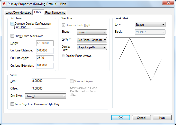 For stairs created in versions of Autodesk Architectural Desktop earlier than 2004, the Override Display Configuration Cut Plane option is selected by default. In the current version, this option is cleared by default, and the display of stair components is handled automatically by specific display configurations for each level.