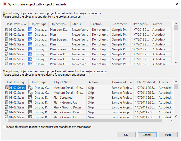 When you synchronize a project or a drawing with its AEC project standards, the styles and display settings in the project drawings are compared with the versions in the standards drawings. If the version of the style or display setting in the project drawing is not identical to the version in the standards drawing, you can choose from several possible actions regarding the style or display setting.