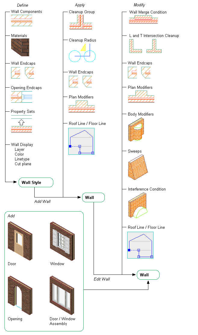 Specifying Wall Display: the visual appearance of a wall is defined in the wall style. Define the layer, color, linetype settings of the individual wall components, hatching, and the cut plane display of the wall in plan views. The display settings defined in the wall style can be overridden for an individual wall.