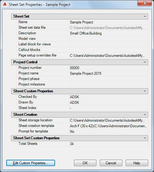 The properties of the project sheet set are initially defined by the sheet set template you assigned when you created the project. However, you can change the settings for an individual project.